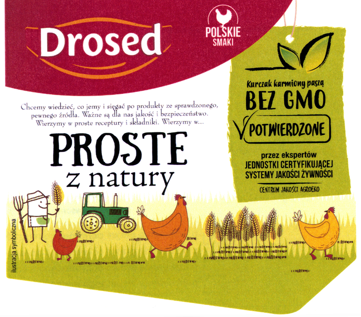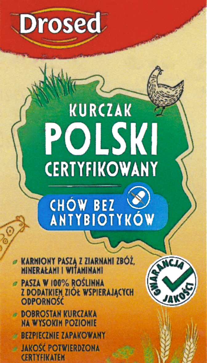 Drosed POLSKIE SMAKI Kurczak karmiony paszą BEZ GMO POTWIERDZONE przez ekspertów JEDNOSTKI CERTYFIKUJĄCEJ SYSTEMY JAKOŚCI ŻYWNOŚCI CENTRUM JAKOŚCI AGROEKO Kurczak KUKURYDZIANY UNIKALNY SMAK SŁONECZNY KOLOR WYŚMIENITY NA ROSÓŁ | R.328494 | 2019-07-09 | aktywny | |