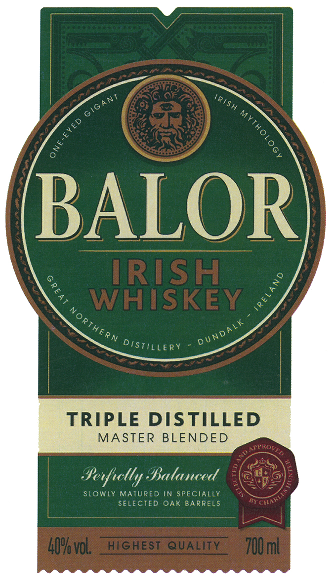 ONE EYED GIGANT IRISH MYTHOLOGY BALOR IRISH WHISKEY GREAT NORTHERN DISTILLERY DUNDALK IRELAND TRIPLE DISTILLED MASTER BLENDED Perfectly Balanced SLOWLY MATURED IN SPECIALLY SELECTED OAK BARRELS HIGHEST QUALITY SELECTED AND APPROVED BY CHARLES HUNTER |