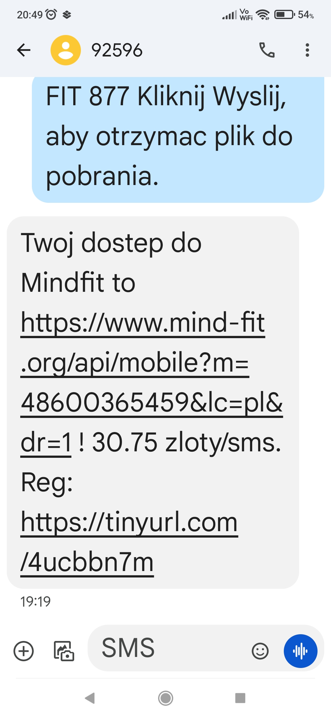 Nastepnie otrzymalem z tego nr sms: Twój dostep do Mindfit - przesylam zalacznik.