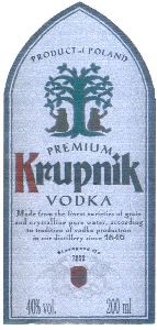PRODUCT of POLAND PREMIUM Krupnik VODKA Made from the finest varieties of grain and crystalline pure water, according to tradition of vodka production in our distillery since 1846 Starogard Gd TRRD 1846 | R.347163 | 2015-01-20 | aktywny | |