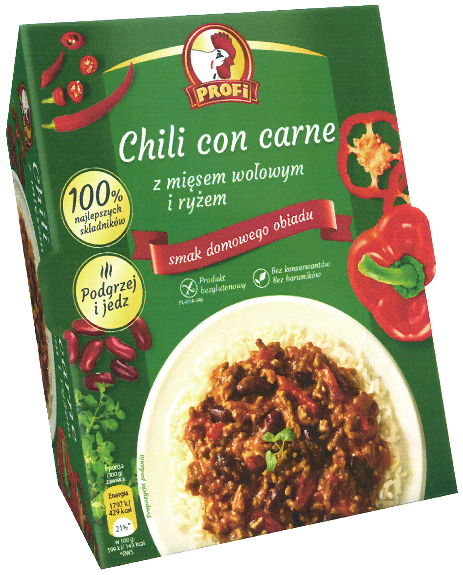 PROFi Chili con carne z mięsem wołowym i ryżem smak domowego obiadu 100 % najlepszych składników Podgrzej i jedz Produkt bezglutenowy Bez konserwantów Bez barwników | R.326169 | 2019-02-25 | aktywny | |
